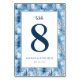 Diese Tischnummer zeigt ein ruhiges Winterthema mit einer weichen blau-weißen Farbpalette, die eine beruhigende und elegante Atmosphäre schafft. Das Design zeigt zarte, schneebedeckte Bäume im Hintergrund und fügt Ihrem Event-Dekor eine Note der Schönheit der Natur hinzu. Die große, fette Ziffer ist von sauberen Linien umrahmt, wodurch sie auf einen Blick leicht zu erkennen ist. Perfekt für Hochzeiten oder Feiertagsveranstaltungen, vereint diese Tischnummer Stil und Funktionalität nahtlos.