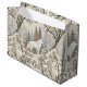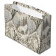 In der ruhigen Winterwaldgeschenktasche steht ein majestätischer weißer Wolf, umgeben von schneebedeckten Bäumen in sanften Tönen aus Creme, Braun, Grau und Blassblau. Ein zweiter Wolf ist subtil in der unteren Ecke eingebettet und deutet auf unsichtbares Leben im ruhigen Wald hin. Mit einer Mischung aus nackten und immergrünen Bäumen, gerahmt von zarten dekorativen Elementen, erinnert dieses Design an natürliche Schönheit, Stille und eine Touch der Wintermagie. Ideal für Naturliebhaber, Tierfreunde und saisonale oder fantasievolle Momente.