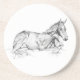 Eine Schwarz-Weiß-BIRO (Kugelschreiber) Abbildung/zeichn eines jungen Pferdes, das auf dem Boden liegt und gerade aus seinem Nickerchen wecke. Vom BIRO Künstler Robin Hewitt.