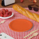 Ruhiger und einfacher orangefarbener texturierter pappteller