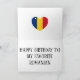 Das schöne Design umfasst glückliche Ballons und Knöpfe mit den Worten "Happy Birthday", die in den Farben der rumänischen Flagge überdeckt sind. Das Design ist mit dem Herz in den rumänischen Flaggenfarben und der Geburtstagsbotschaft fertig. Die Elemente können mit der Funktion "Anpassen!" vollständig angepasst werden. Diese farbenfrohe Geburtstagskarte ist das perfekte Geschenk für einen rumänischen Freund. © CountriesOfTheWorld