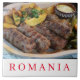 Ein nahes Foto einer Platte Mici, rumänische Würstchen aus traditioneller Minze, die auf einer Keramik aus Souvenir gedruckt sind.