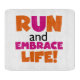 Lauf und Embrace Life Text T - Shirt, Hoodies, Magnete, Mousepads, Karten, Aufkleber, Schlüsselketten, Buttons, Magnete, Papier-Teller und Servietten, Geschenktaschen, Bonbons, Uhren und viele andere Gegenstände mit einem hellen rosa und orangefarbenen Design. Diese Running-Theme-Produkte machen großartige Geschenke für jeden, der zum Spaß läuft, läuft Track, Marathons, Halbmarathons, 10Ks, oder 5Ks!