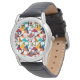 Diese Uhr hat ein modernes Design aus verstreuten Dreiecken, einige mit Löchern, in Retrofarben.