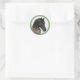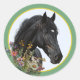 Schwarze Pferdeaufkleber. Wildblumen wachsen nahe am Kopf eines schönen schwarzen Pferdes. Er hat ein winziges Weiß im Gesicht, aber alles andere ist schwarz. Der Aufkleber ist blassblau mit einer grünen Grenze und einer dünnen Linie aus gelbem Gold. Rundaufkleber sind in zwei Größen erhältlich.