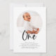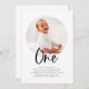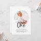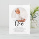 Eine moderne erste Geburtstagseinladung mit einem runden Foto und dem Wort "eins" in einem kalligraphischen Schriftart, perfekt für das 1. Geburtstag Ihres kleinen Party!