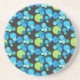 Ein runder Sandstein Untersetzer oder ein Drink matt, mit einem abstrakten "Blue Moons"-Muster in heller Blues und Neon-grün auf schwarzem Hintergrund; von Judy Adamson, einem handbemalten Collage-Design.