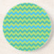 Ein markanter runder, sandsteinreicher Untersetzer mit einem Zickzackmuster aus türkisfarbenen und grün grünen Chevrons auf neongrünem Hintergrund. Teil der Posh & Painterly 'Blue Moons' Kollektion, basierend auf einer handbemalten Papiercollage von Judy Adamson.