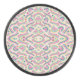 Runder Untersetzer mit lebendigem, symmetrischem Mandala-Muster in rosa, blauen und gelben Farbtönen auf weißem Hintergrund. In Vorder- und Schrägansicht dargestellt.