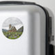 Rund Souvenir Kühlschrankmagnet mit einer hölzernen Stachelkirche mit Grabsteinen und Gräbern auf einem Friedhof am Rande eines Fjords zwischen den Bergen in Gaupne, Sogn og Fjordane in Norwegen.