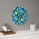 Eine schicke Wall-Uhr mit einem geheimnisvollen blauen Mondmuster in Aqua, Türkis, Smaragdgrün, Neon Green und Dazzling Blue auf schwarzem Hintergrund. Teil der Posh & Painterly 'Blue Moons' Kollektion.