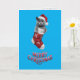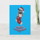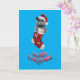 Eine russische Blaukatze trägt eine Weihnachtsmannmütze und hält sich aus einem Weihnachtskater heraus.
