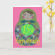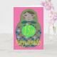 15. Geburtstagskarte mit einem Bild einer klassisch geformten russischen Puppe mit farbigen Kreisen, auf einem rosa Hintergrund.