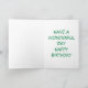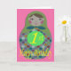 1. Geburtstagskarte mit einem Bild einer klassisch geformten russischen Puppe mit farbigen Kreisen auf rosa Hintergrund.