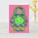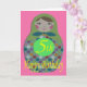 5. Geburtstagskarte mit einem Bild einer klassisch geformten russischen Puppe mit farbigen Kreisen auf rosa Hintergrund.