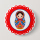 This Matryoshka button is in red, blue, yellow and white colors. The button is designed with matryoshka, Russian nesting doll on lace background.