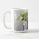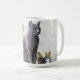 Porträt einer reinrassigen russischen blauen Katze im Stillleben mit Tulpen und Birnen