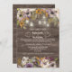 Schöne Hochzeitsfeier Dinner Einladung mit einem rustikalen Holzhintergrund entworfen. Rost, lila und Elfenbein cremefarbene Aquarellfarben, schlaue grüne Blätter, Saitenleuchten und Laternen bestechen durch dieses Landschafts-Hochzeitsdesign.