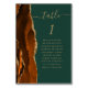 Der links Rand dieser eleganten, modernen Hochzeitskarte weist eine in Orange- und Rostfarbe gehaltene, mit Imitaten vergoldeter Glitzer bespannte Tischnummer auf. Das Wort "Tabelle" erscheint in goldfarbenem Schriftzeichen auf dunkelgrünem Hintergrund. Fügen Sie die Namen Ihrer Gäste hinzu, die jeder Tabelle zugeordnet sind.
