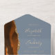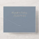 Die links Kulisse dieses eleganten, modernen und einladenden Hochzeitszimmers und der UAWG mit einem verbrannten, orangen und rostfarbenen Wasserfarbenstreifen besticht durch den vergoldeten Glitzer der Imitate. Die abnehmbare RSVP-Karte bietet Platz für die Gäste, um die Auswahl von drei Eingängen zu aktivieren. Der individuell anpassbare Text kombiniert blassgoldene Handschrift, Copperplate und kursiv Schriftart auf einem staubblauen Hintergrund. Die Rücksendeadresse erscheint auf der Außentafel und auf der Rückseite der UAWG.