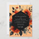 An artistic display of moody botanicals sets a dramatic tone for your nuptials. This painterly design features vibrant rust-orange roses and deep crimson blossoms, artfully arranged against a warm apricot backdrop. Dark, charcoal-hued foliage provides a striking contrast, creating an elegant and romantic atmosphere.