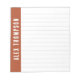 Lined notepad personalized with name in white letters written across the side against rust red.