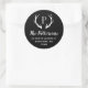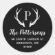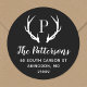 Maßgeschneiderte Rundaufkleber mit Rücksendeadresse personalisiert mit Ihrer Familienmonogramm und Adresse. Dieses moderne rustikale Design zeichnet sich durch ein Monogramm aus, das Sie mit Hirschantlern in Schwarz-Weiß-Farben beginnen. Verwenden Sie die Designtools, um die Hintergrundfarbe und die Schriftart zu ändern, um Ihr eigenes, einzigartiges Design weiter anzupassen. Ideal für die Behandlung von Urlaubskarten, Hochzeitsartikeln und vieles mehr.