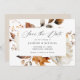 Elegant fall-themed save the date featuring watercolor autumn flowers and foliage in shades of ivory, cream, orange, and brown. "Save the Date" is displayed in a modern calligraphy script with your names and wedding details shown below. The fall floral save the date coordinates with our Rustic Autumn Floral wedding collection.