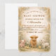 A charming countryside design featuring a fluffy calf, a sweet little lamb, and tiny yellow chicks nestled among soft meadow wildflowers. The warm parchment background and muted earth tones create a cozy, rustic atmosphere with a gentle storybook feel. Delicate greenery frames the layout while the farm animal illustration adds warmth and personality. Perfect for a neutral rural-themed celebration with classic farmhouse charm.