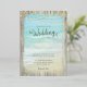 Schöne aquablaue Ozeanwellen stürzen in diesem Hochzeitsdesign am Strand auf, gerahmt mit rustikalem, verwittertem Holz, mit der zusätzlichen Eleganz von echten goldenen Folientexzenten an den Saitenleuchten und den Namen des Hochzeitspaar. Diese Einladungen eignen sich hervorragend für Hochzeiten in Urlaubsort, aber auch für Hochzeiten mit Strand- und Küstenthemen.