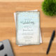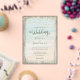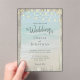These beach themed acrylic wedding invitations feature a rustic wood frame, with a semi-transparent ocean scene in the background, and string lights decorating the top. These wedding invitations are perfect for destination weddings, as well as any beach and coastal themed wedding.