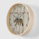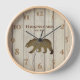 Silhouette eines schwarzen Bären auf rustikalen, hellen Holzplanken. Anpassbare Familienname oder Lodge und feststehendes Datum. Rustikale Berghütte Stil.