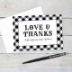 Eine festliche und stilvolle Hochzeit "Liebe und Dank" danke Ihnen Karte für eine lässige Sommer Hinterhof GRILLEN Veranstaltung. Enthält den benutzerdefinierten Text für die Braut- und Bräutigamen oder andere Formulierungen. Schwarz-Weiß Design Farben mit einem Gingham / Tischdecken karierten gemusterten Hintergrund. Das geklappte Kartenformat enthält Platz auf der Innenseite für eine handgeschriebene Nachricht.