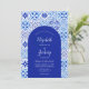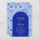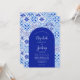 Dieses rustikale Design zeichnet sich durch ein Hintergrundmuster aus blau-weiß Aquarell portugiesischen Fliesen oder Azulejos. Personalisieren Sie es mit den Namen der Braut und des Bräutigams in weißer Kalligraphie-Schrift und dem restlichen Text in einer Kombination aus Sans Serif, Copperplate und Kursivschrift auf einer blauen Bogenform. Auf der Rückseite wird ein passendes Fliesenmuster angezeigt.