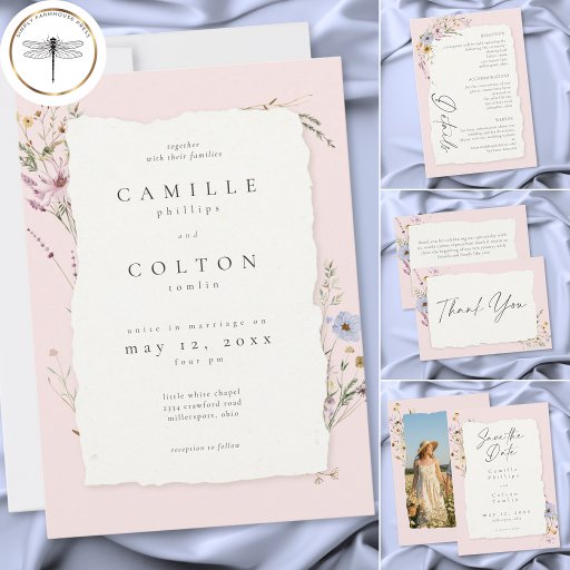 This blush floral wedding details enclosure card features a soft pastel background, delicate wildflowers, and a handmade torn edge paper look. Perfect for romantic garden weddings, it offers an elegant, modern style with timeless charm for couples seeking a refined wedding design. Created by Simply Farmhouse Press.