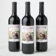 Die rustikale, schicke Hochzeitsweinflasche begünstigen Aufkleber mit einem verheirateten Monogramm der Braut- und Bräutigamen, dem Hochzeitstag und der Weinsorte, gepaart mit einem Foto Braut und Bräutigam. Weißer Hintergrund mit dunkelrotem und bordeauxfarbenem Text.
