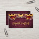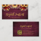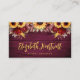 Diese rustikale Visitenkarte besticht durch einen dunkelburgundischen Holzhintergrund mit einem oberen, blumengeschmückten Rahmen aus gelben Sonnenblumen und bordeauxfarbenen Blüten. Personalisieren Sie es mit Ihrem Namen in gelben Schrift und Ihre Geschäftsinformationen in serifenlosen serifenlosen Schriftart. Auf der Rückseite der Karte finden Sie gelben Text auf demselben bordeauxfarbenen Holzhintergrund, sowie einen QR-Code, der Kunden auf Ihre Business-Website leitet.