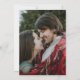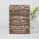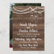 Eine perfekt rustikale Hochzeitseinladung mit Lichterketten, Glaskeramikgläsern und einem Holzausseher. Ein Foto der zukünftigen Braut und des Bräutigams schmückt die Rückseite der Einladung.
