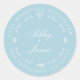 Schick, modern und schlicht Hochzeitsklassiker, runder Aufkleber mit dem Text der Zukunft Mr. und Mrs. in weißem, elegantem Drehbuch auf blauem glattem Hintergrund mit Lorbeeren und anderen rustikalen Dekorationsdetails. Fügen Sie einfach Ihren Namen und Ihre Adresse hinzu. Exklusiv für Sie entworfen von Happy Dolphin Studio. Wenn Sie Hilfe oder passende Produkte benötigen, kontaktieren Sie uns bitte unter happydolphinstudio@outlook.com. Wir helfen Ihnen gerne, Ihre Hochzeit zum schönsten Tag zu machen!