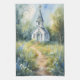 This serene countryside scene captures a quaint white chapel nestled at the end of a winding dirt path, surrounded by blooming wildflowers and softly swaying grasses. Rendered in a delicate watercolor style with painterly splashes and gentle light, the composition evokes peace, nostalgia, and quiet faith. The wildflower meadow—full of bluebells, daisies, and soft greens—creates a dreamy, almost ethereal foreground that leads the viewer’s eye toward the charming steepled church under a calm blue sky. Perfect for evoking a sense of retreat and reflection, this design works beautifully as seasonal decor, especially for spring and Easter themes. It pairs well in cozy cottagecore spaces or country-inspired settings, bringing warmth and spiritual calm to any room. The golden cross atop the steeple and gothic-style arched doorway add vintage architectural charm while maintaining a harmonious balance with the natural surroundings. This is an inviting visual retreat into simplicity, faith, and nature. AI generated artwork.