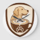 This unique logo design features a heartwarming silhouette of a friendly Golden Retriever paired with a rich latte art coffee cup. The design is elegantly enclosed in a classic shield frame with a rustic wood-grain texture, giving it a premium, vintage cafe vibe.