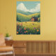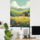 Bring a touch of quiet country life into your home with this charming summer landscape artwork. The scene features a cozy wooden cabin nestled in rolling golden hills, surrounded by lush forests and bright wildflowers swaying in the breeze. Chickens roam freely in the sunlit meadow, adding warmth and life to the peaceful setting.
