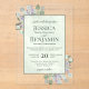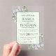 Invite your loved ones to share in your joy on your wedding day with these gorgeous acrylic invitations. The stylish boho chic design features your names prominently displayed in bold letters while the introduction and other notes feature fancy script calligraphy with swashes on the ends of the letters. The text is displayed on a marbled pale sage green colored background. The outside border of the invite is transparent acrylic with hand painted watercolor sprigs of eucalyptus leaves, greenery, and lavender flowers decorating the corners. Elegant, classy, sophisticated and beautiful, these wedding invitations are perfect for a country wedding.