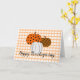 Ein zauberhaftes Trio von Kürbissen voller rustikaler Muster über einem orangefarbenen Gingham-karierte und die Worte Happy Thanksgiving darunter. Im Inneren steht: "Wir wünschen Ihnen das Beste aus der Ferienzeit".