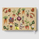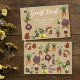 This whimsical baby shower guest book cover is adorned with a charming, nature-inspired illustration. Playful mushroom characters, dressed in bright red caps, hold fruits and vegetables while surrounded by buzzing bees, a butterfly, carrots, a beet, a basket of berries, olives, lemons, and delicate flowers. The artwork creates a joyful garden scene that feels both festive and storybook-like.