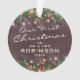 Personalisierte frisch vermählte rustikale Weihnachtsschmuck mit dunklem Holzboden, festlichen Weihnachtsbaumzweigen, Rot- und Goldbaumdekorationen, Streichelleuchten, dem bezaubernden Sprichwort "unsere ersten Weihnachten als Mr & Mrs", Ihrem Namen und dem Jahr. Auf der anderen Seite ist ein Foto ihres Enkelkindes.