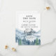 Elegant rustic watercolor mountain and forest wedding save the date featuring lush blue and green trees and misty mountains, paired with a soft script quote, let the adventure begin. Designed for couples who love a romantic, dreamy woodland vibe for their ceremony and celebration, this matching piece helps you announce your date early while keeping your paper details cohesive. Personalize the names, wedding date, and location to fit your day, then pair it with the coordinating invitation and suite pieces for a beautifully unified look. Available in print, as a digital download, or both.