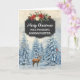 Frohe Weihnachten für eine Patcherkarte mit rustikalem Kalkboard-Muster und schneebedeckter Wasserfarbenwaldszene mit Hirsch und Vögeln.