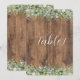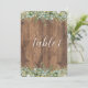 Add a cohesive botanical touch to your reception tables with these elegant table numbers featuring eucalyptus greenery, white florals, gold accents, and wood background styling.
