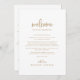 Diese rustikalen goldenen Hochzeitstitel sind perfekt für eine Hochzeitsfeier. Das schlichte und moderne Design in Gold und Weiß zeichnet sich durch eine einzigartige handgeschriebene Kalligraphie aus, die in einem zeitgenössischen minimalistischen Boho-Stil gehalten ist. Anpassbar in jeder Farbe. Behalt das Design minimal und simpel, wie es ist, oder personalisiere es durch Hinzufügen von eigenen Grafiken und Kunstwerken. Auf der Vorderseite der Karte befindet sich ein Begrüßungsschreiben, auf der Rückseite der Karte befindet sich der Hochzeitstag. Diese Noten sind ideal für Hochzeiten in Urlaubsort und Begrüßungstaschen für Hotelgäste.
